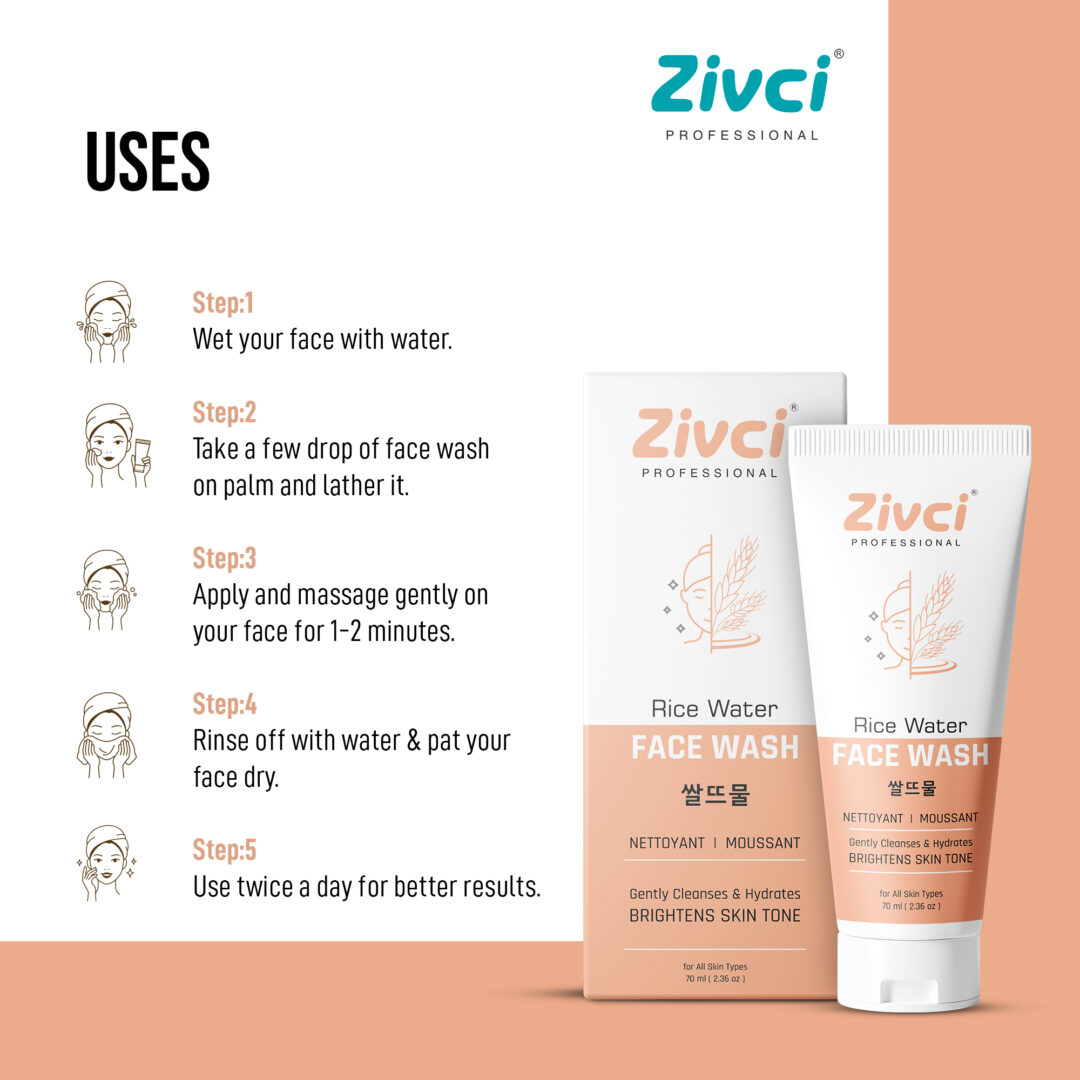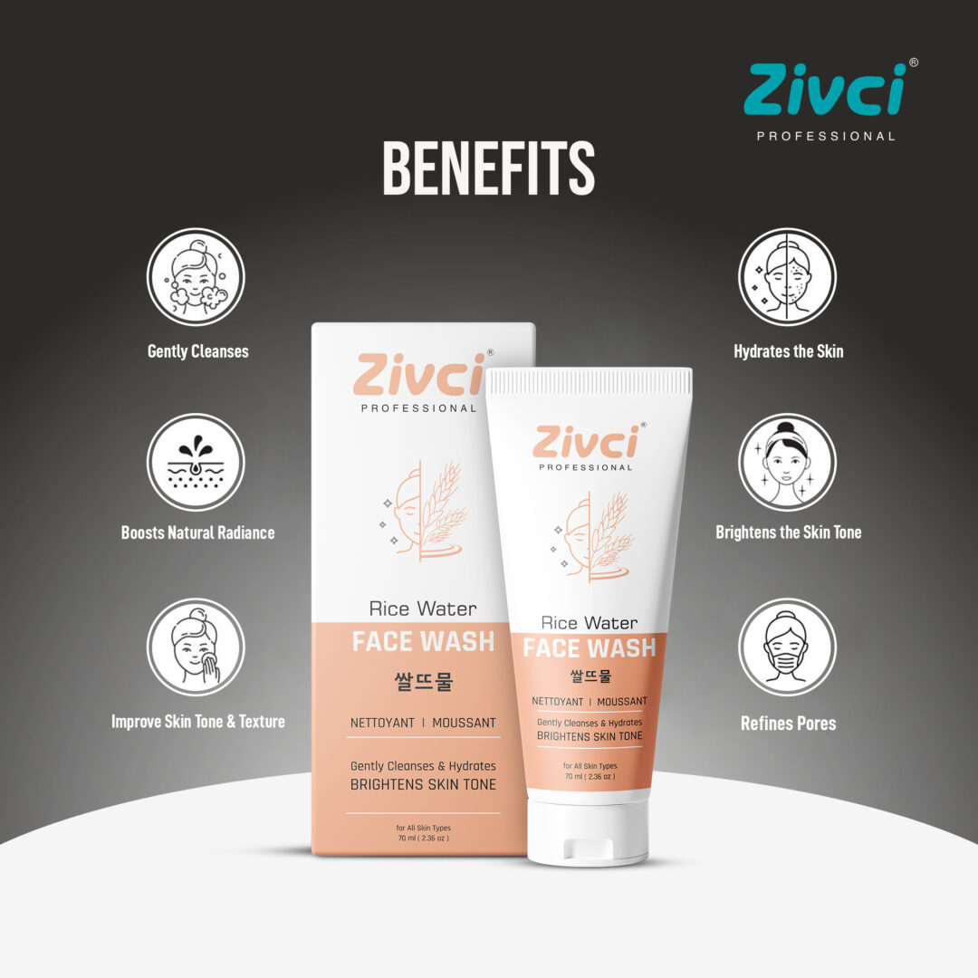 Zivci Professional Rice Water Face Wash is a gentle yet effective daily cleanser enriched with the traditional skin-loving benefits of Fermented Rice Water, known for its brightening, soothing, and hydrating properties.